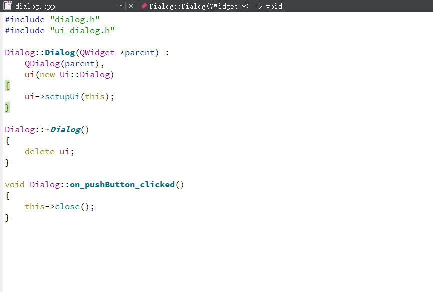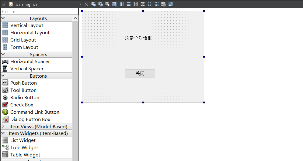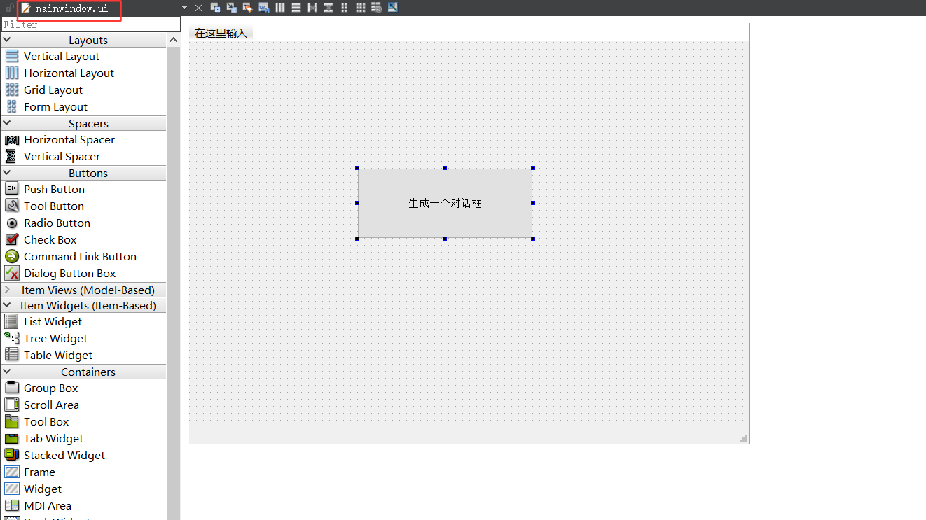 但是在我们一般使用QDialog的时候往往不是直接在创建项目的时候继承自Dialog。而是在代码中,创建额外的类,让额外的类继承自QDialog。因为我们的主窗口一般不会作为一个对话框,主窗口可以一些其他的对话框。举一个简单的例子,通过一个按钮来创建一个新的对话框