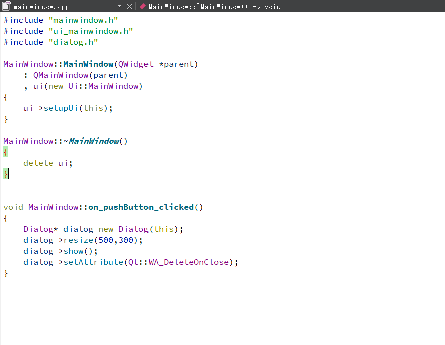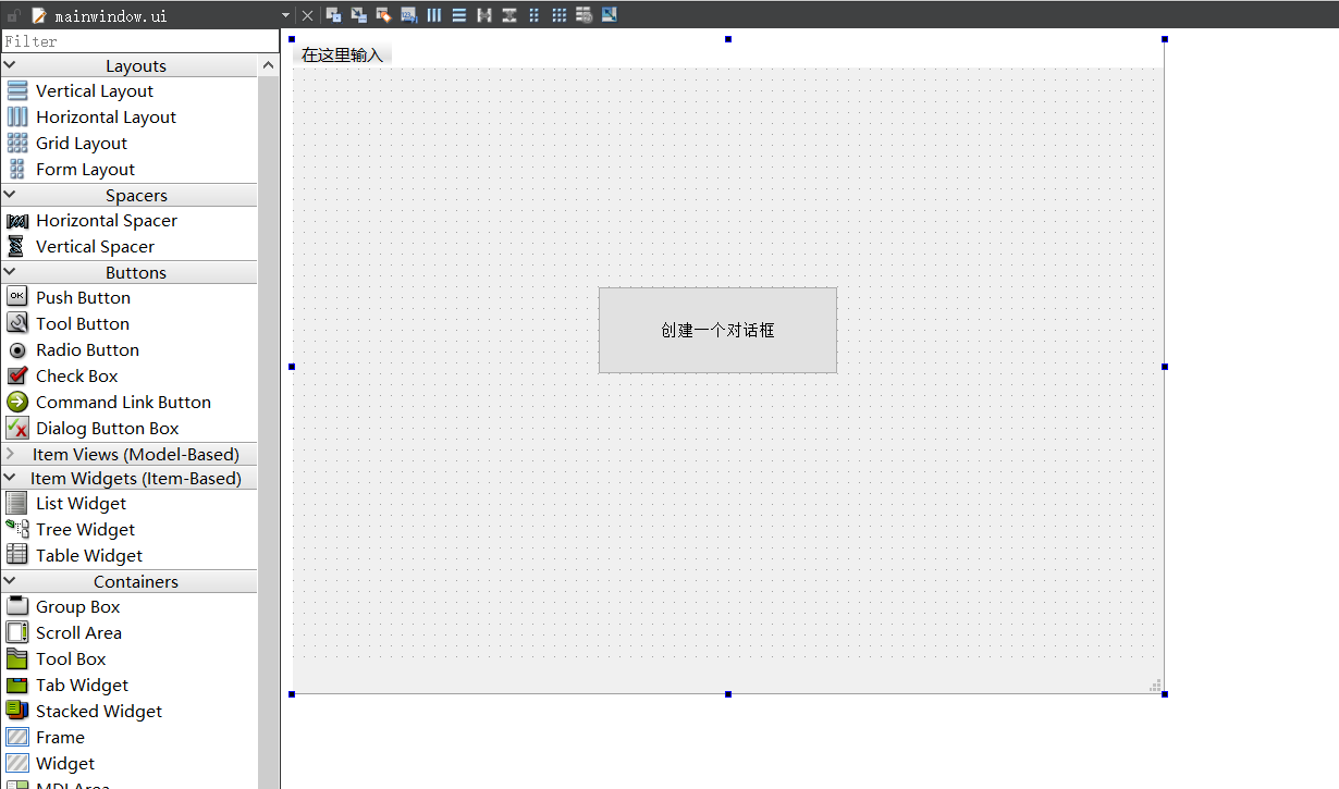 创建完后就可以写代码了。思路是在dialog相关文件中设置相关的控件以及属性,和平时在窗口上设置是差不多的,然后在mainwindow中创建并设置Dialog