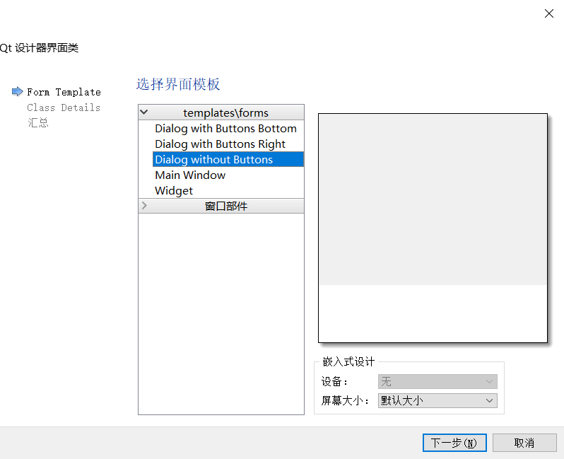 QDialog是一个对话框,我们针对一个已有的项目,也可以创建一些类,继承自QDialog实现咱们自定义的对话框。同时我们Qt也提供了很多现成的对话框,比如内置的对话框有:QFileDialog(文件对话框)、QColorDialog(颜色对话框)、QFontDialog(字体对话框)、QInputDialog(输入对话框)、QMessageDialog(消息对话框)。如果在创建项目的时候直接选择父类是它的话,其实创建出来后的界面其实和QWidget差不多