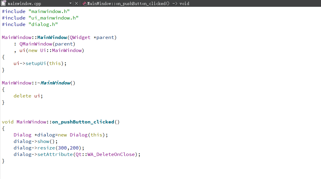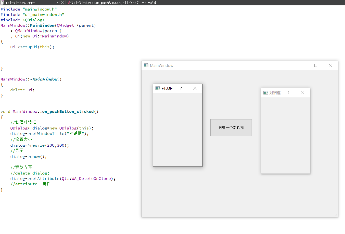 那我们直接使用delete吗?肯定不可以,这样只会使得对话框弹出来一瞬间又立马消失了,正确的做法应该是把delete和关闭的按钮的点击信号关联起来,用户点击×的时候,触发delete,但是Qt也提供了更简单的设置属性来完成上面的操作,即Qt::WA_DeleteOnClose