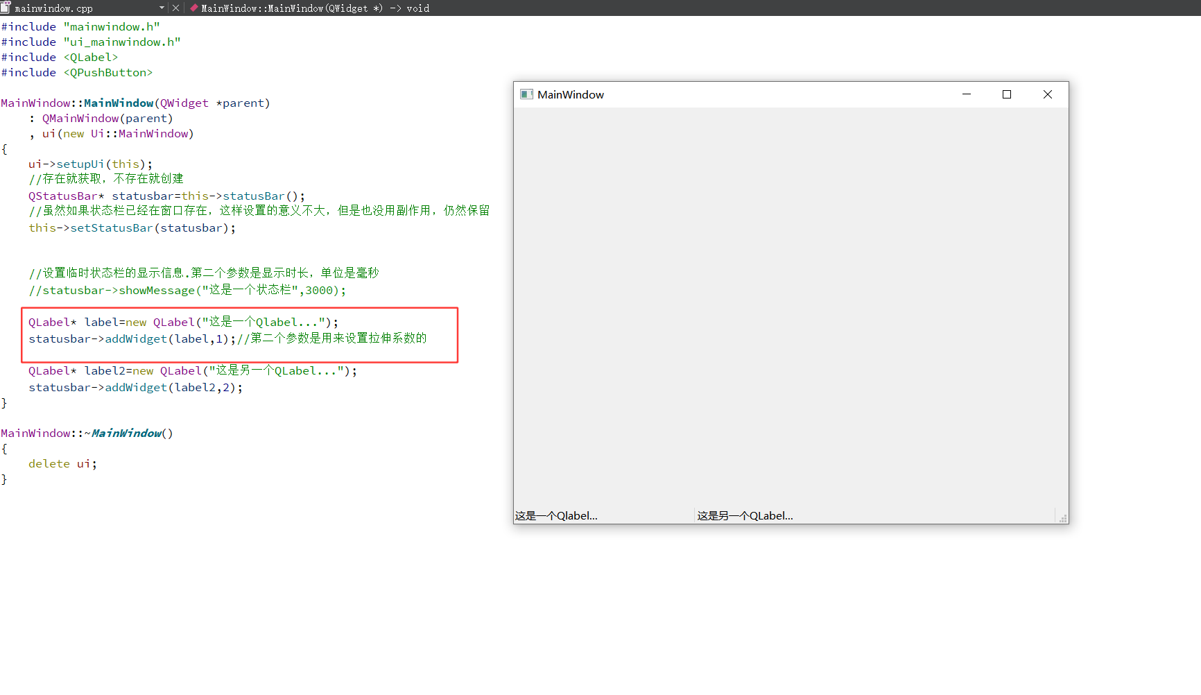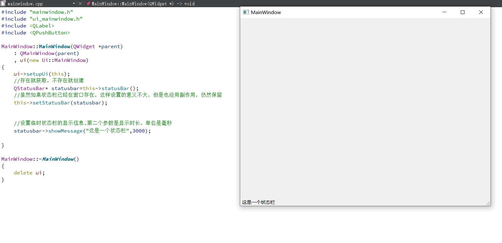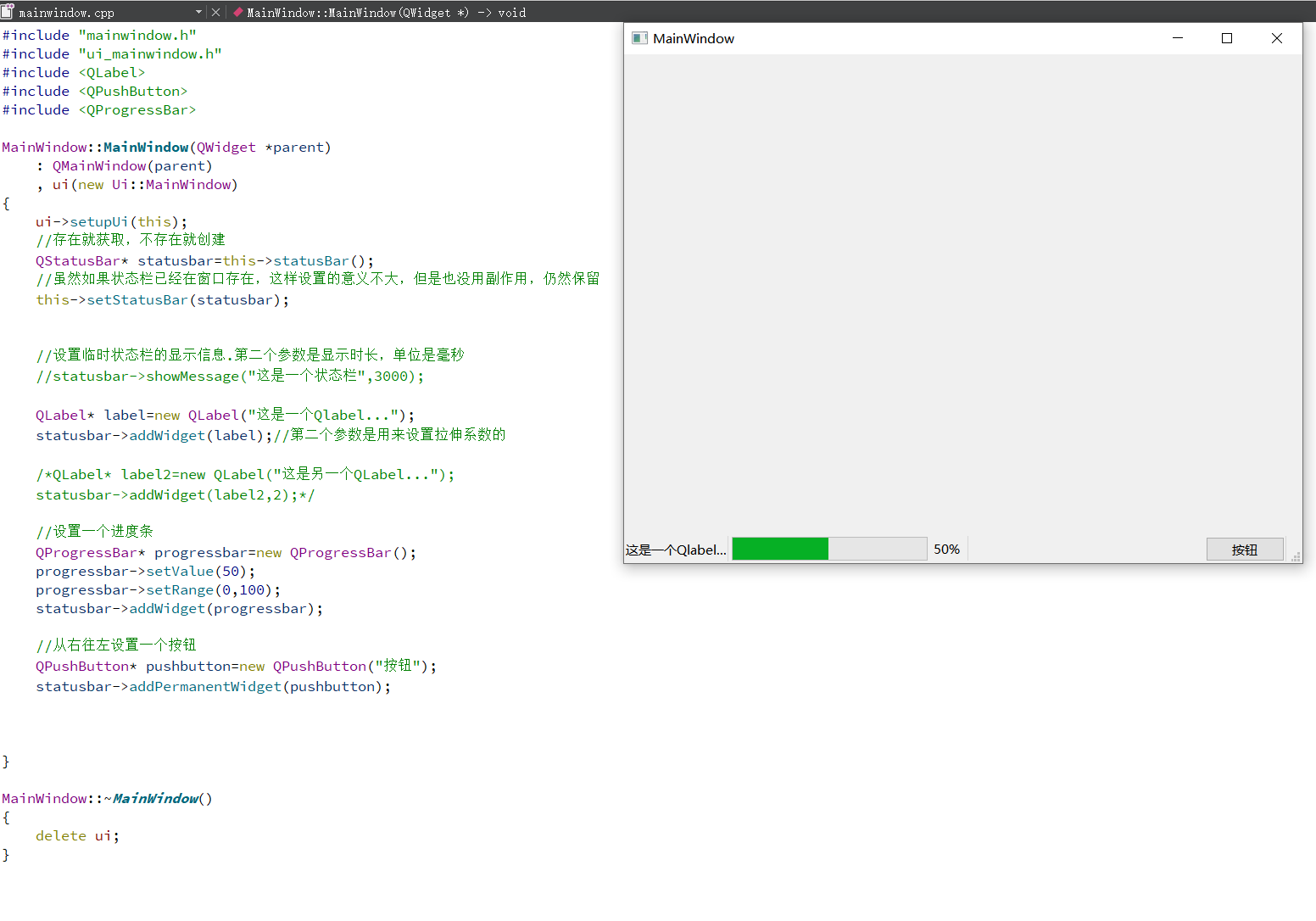 接下来要说的是窗口的状态栏,主要是用来提示一些信息什么的,用法也比较简单。我们直接举代码的例子
