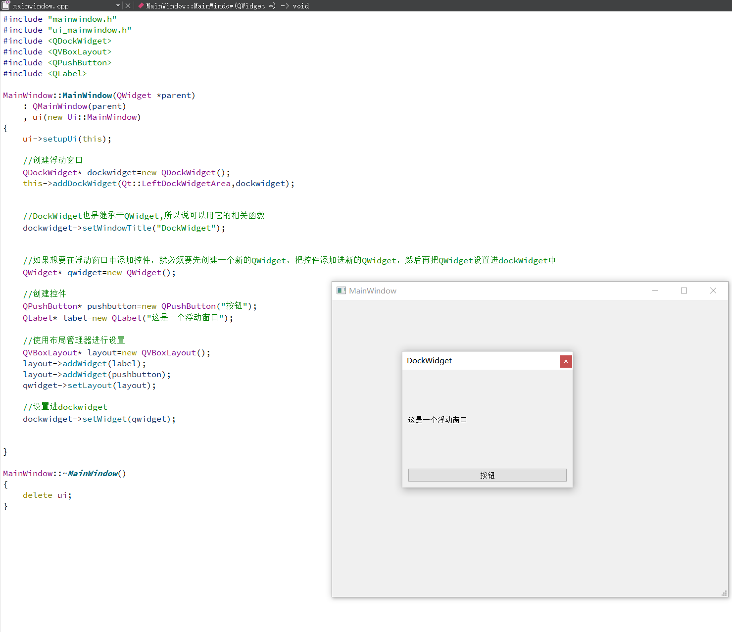 然后最主要的就是我们想要在QDockWidget中想要创建控件,就必须要一个额外的QWidget才行,我们将各种控件都创建在QWidget中,方法和在正常的窗口差不多,就是参数从this变成了qwidget,最后qwidget设置进dockwidget即可