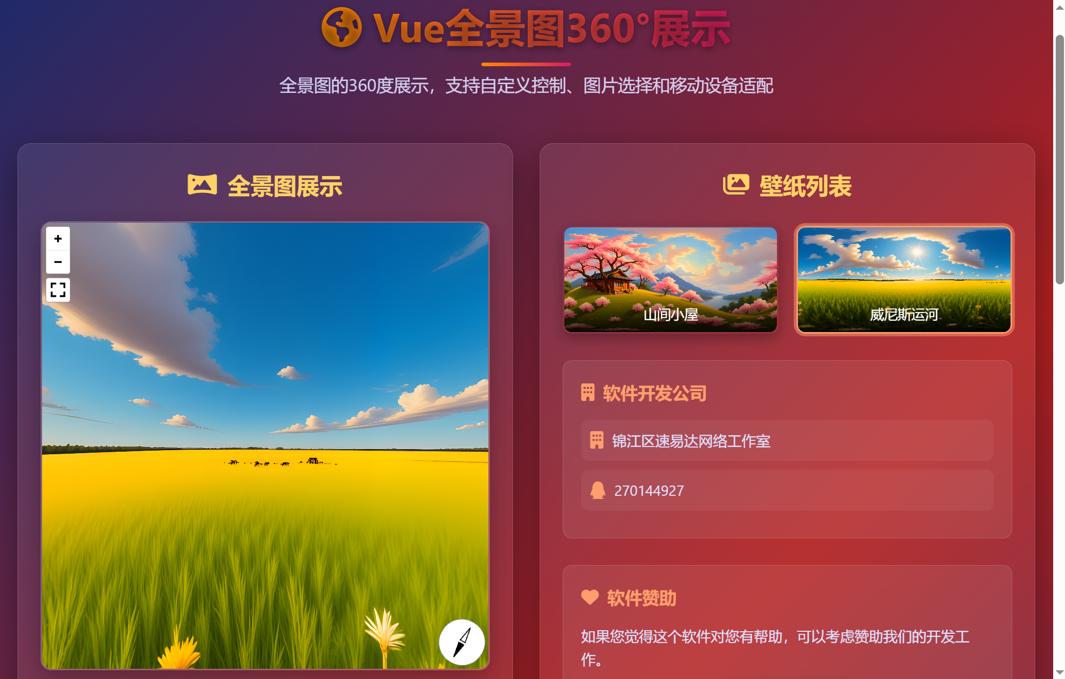 | 壁纸列表 | 预设或用户上传的全景图库。 | 示例"山间小屋"、"威尼斯运河"展示了其在虚拟旅游、房产展示等场景的应用潜力。用户可以快速切换场景。 |