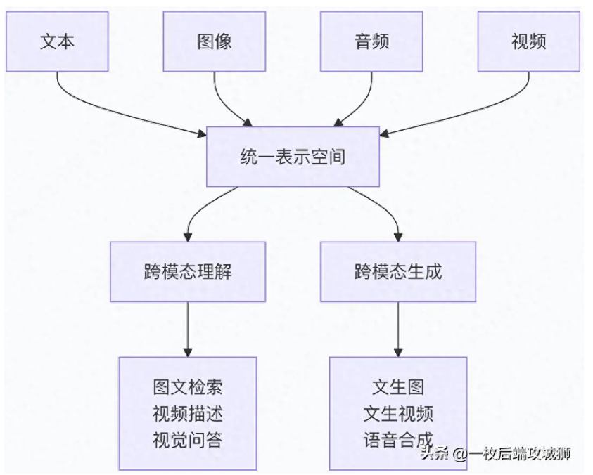 跨模态处理:涉及在不同模态间进行信息转换或关联,例如语音识别(听觉到文本)或文生图(文本到视觉)。关键挑战是识别语义差异并准确映射信息。