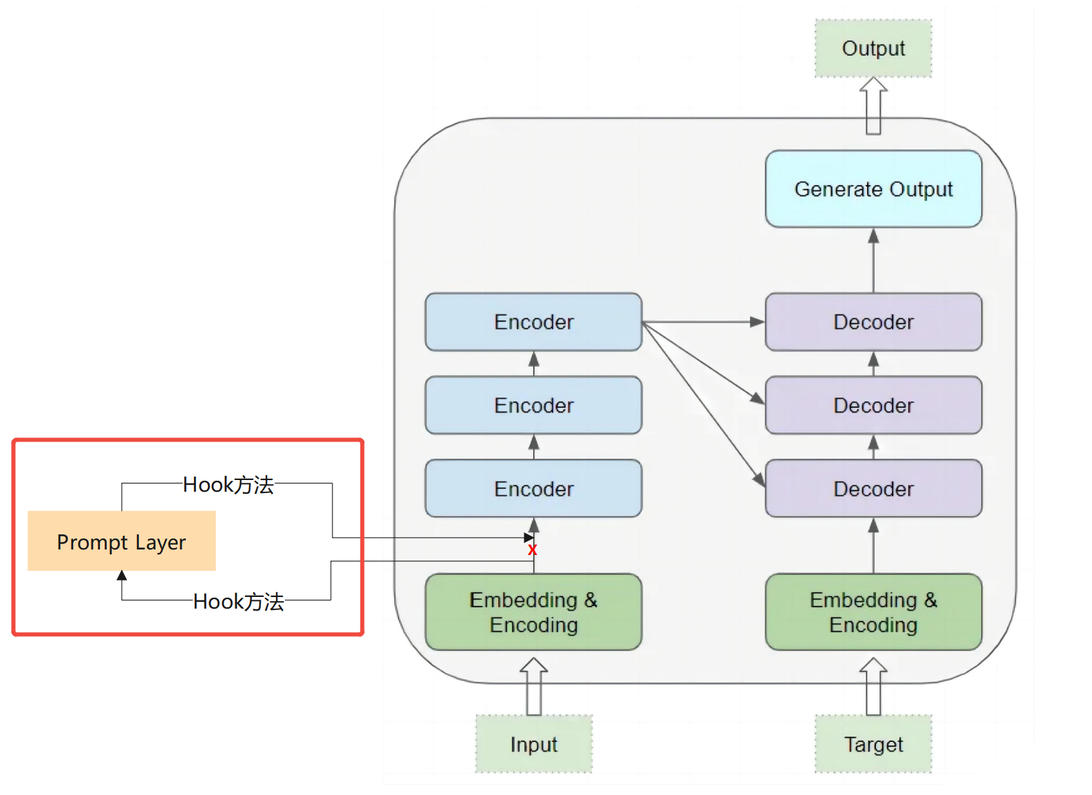 - 增加的位置:原始输入嵌入之后,嵌入矩阵进入Encoder/Decoder之前 。以Transformer架构为例,示意如下: