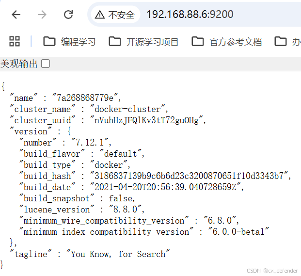 访问地址:docker所在主机IP:9200,例如 192.168.88.6:9200 返回es的一些基础信息