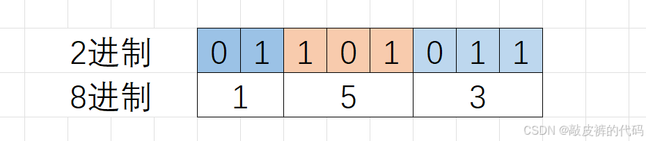 8进制的数字每一位是0~7的数字,各自写成2进制,最多有3个2二进制位就足够了,比如7的二进制是111,所以在2进制转8进制的时候,从2进制序列中右边低位开始向左每3个2进制位会换算一个8进制位,剩余不够3个2进制位的直接换算。