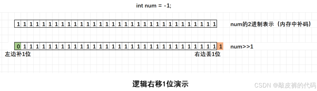 - 逻辑右移:左边用0填充,右边丢弃