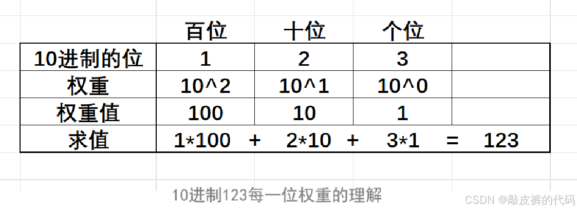 其实10进制的123表示的值是一百二十三,为什么是这个值呢?其实10进制的每一位都是有权重的,10进制的数字从右向左是个位、十位、百位......,分别每一位的权重是 ,