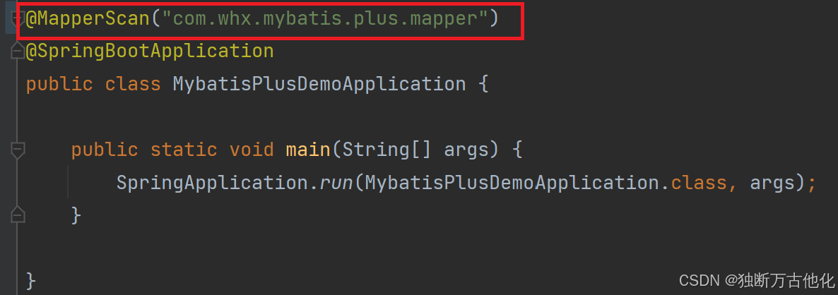 也可以在启动类上添加 @MapperScan ,扫描Mapper文件夹,如下:(二选一即可)