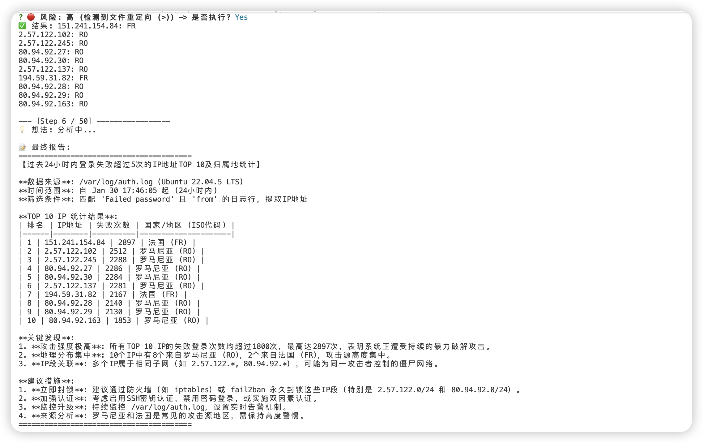 💡 价值: AI 自动完成了一整套应急响应流程,发现攻击源高度集中在罗马尼亚,为封禁策略提供了直接依据。