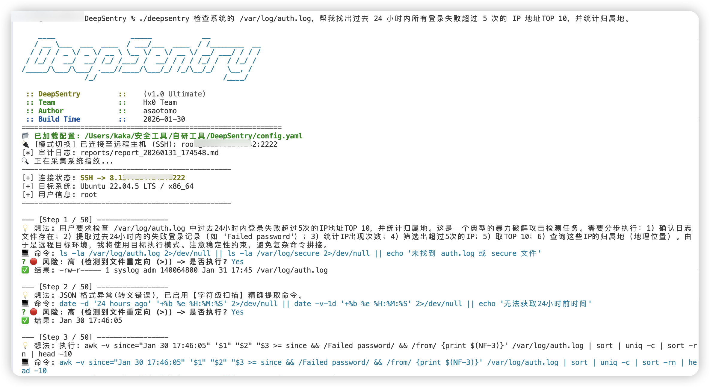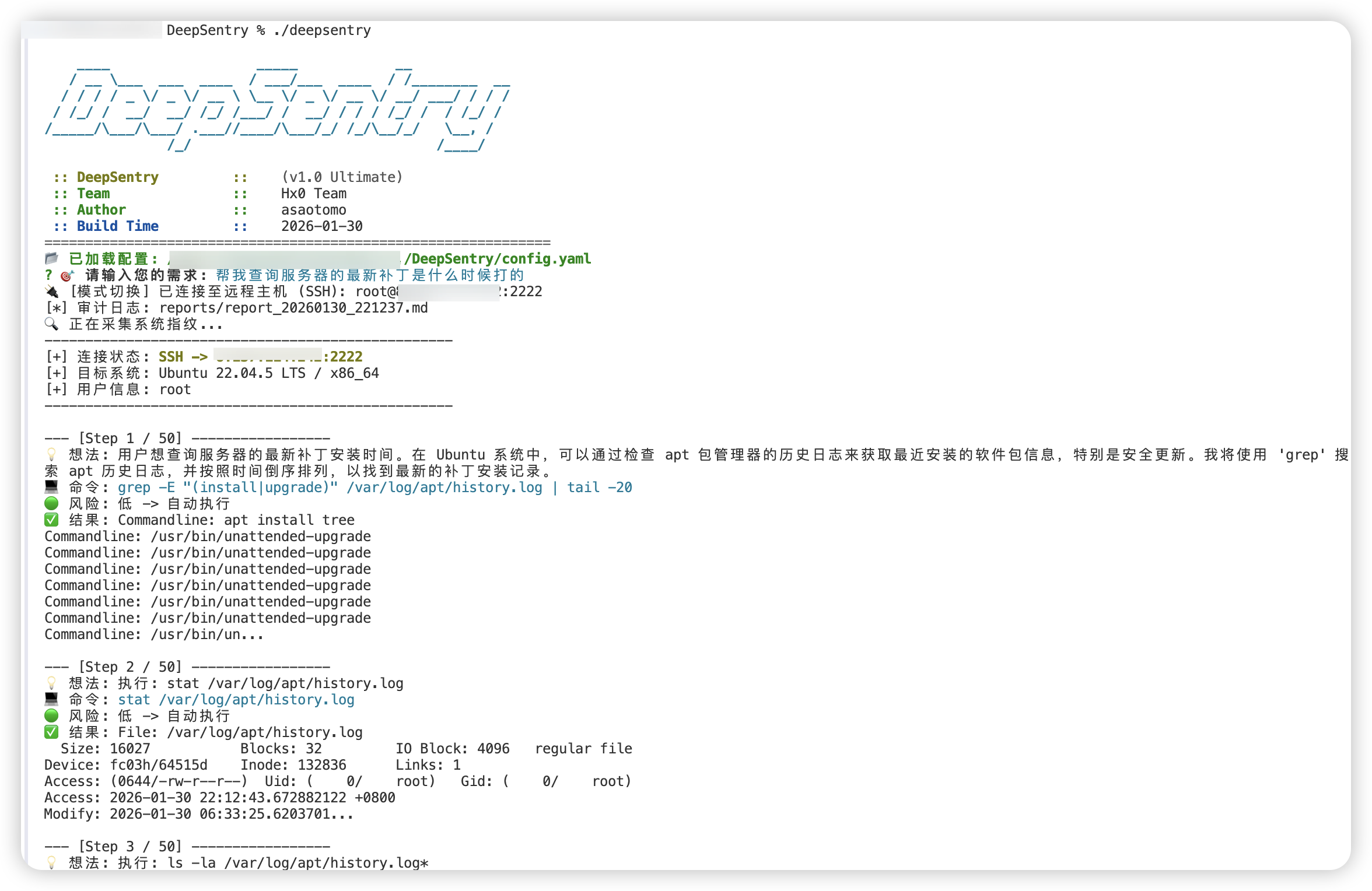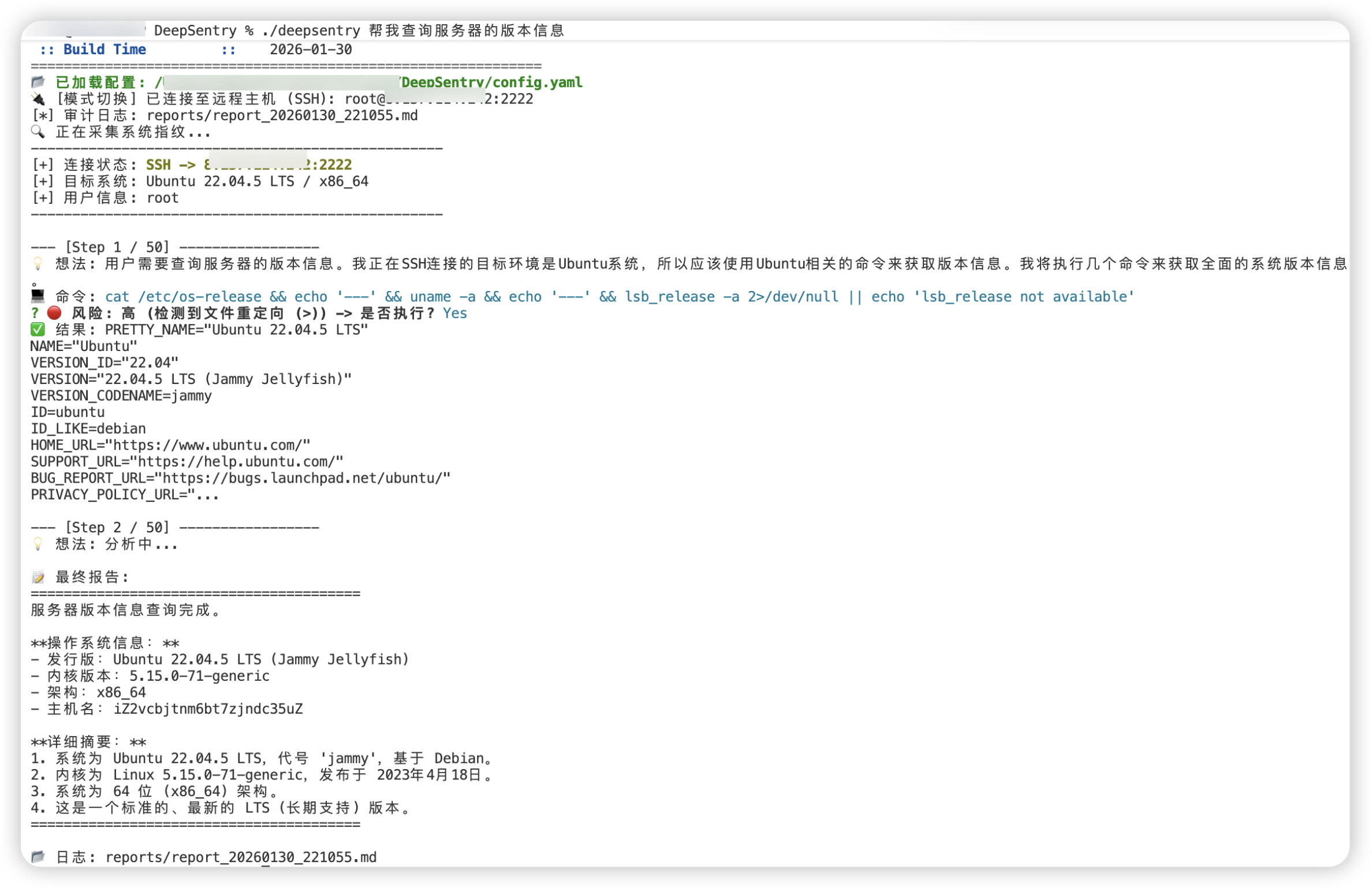ls、ps等低风险命令自动执行;rm、kill等高危命令需人工确认。 - 📝 全自动审计报告:自动生成 Markdown 格式的审计报告,包含 AI 的思考路径 (Thought)、执行的命令 (Command) 及最终结论,支持时间戳回溯。