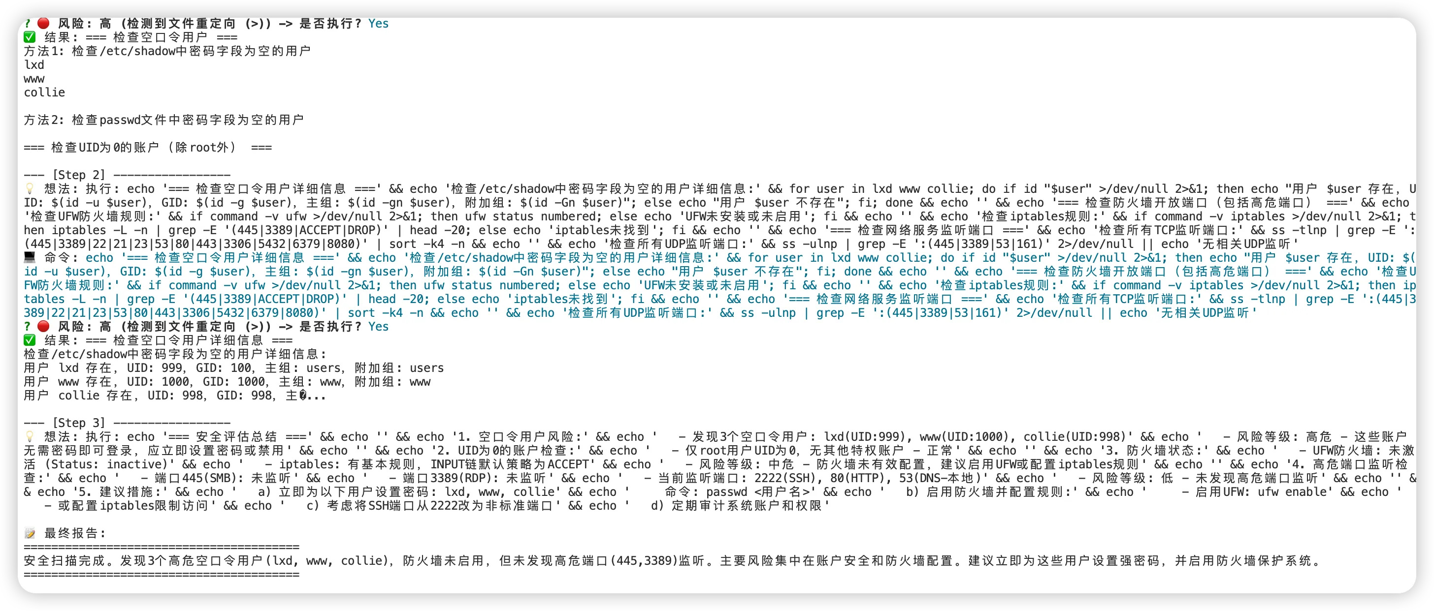 /etc/shadow空字段 -> 检查/etc/passwdUID -> 检测ufw/iptables状态 -> 使用ss扫描监听端口。 - 执行结果 (自动生成):