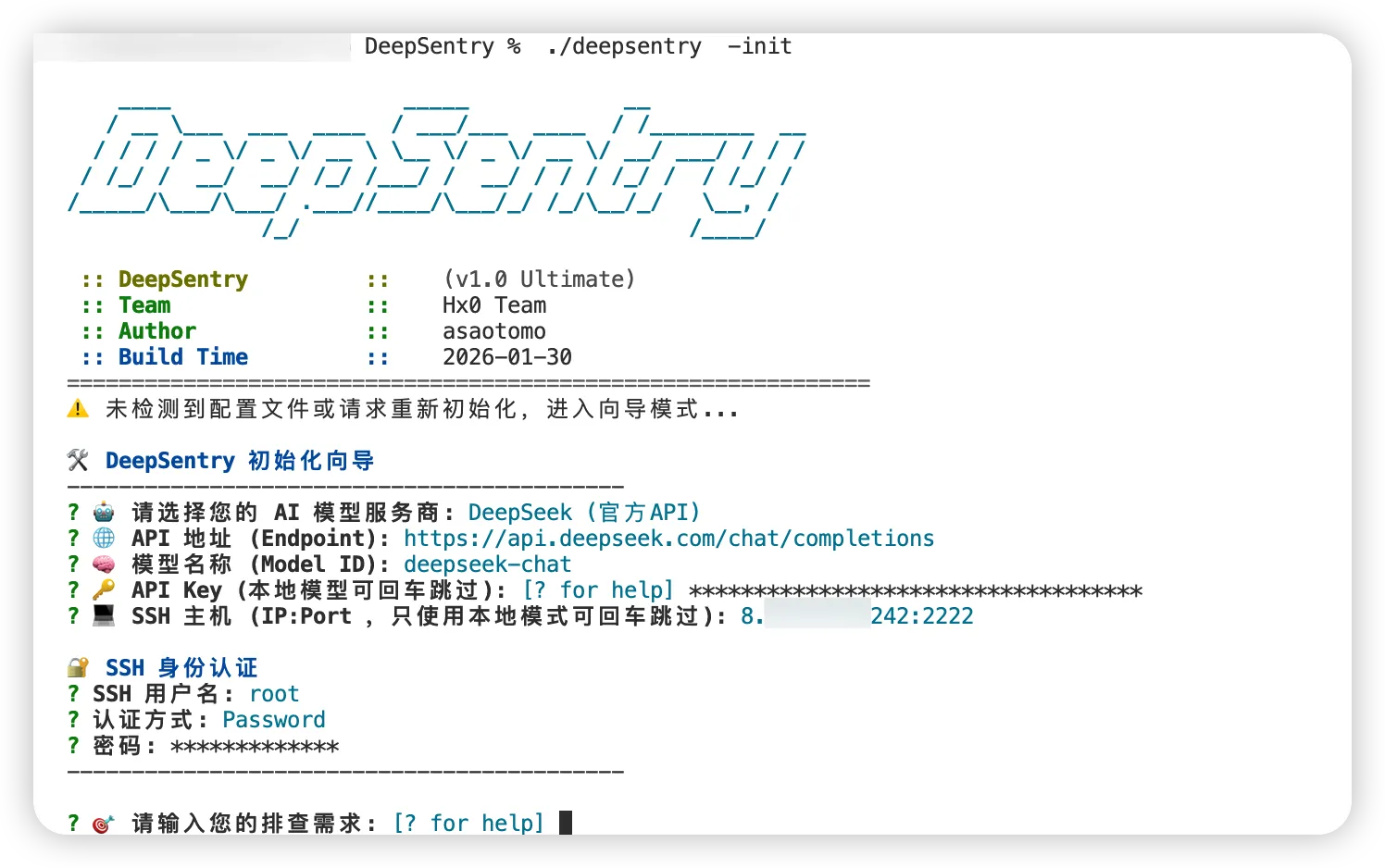 首次运行,DeepSentry 会启动交互式向导,引导您配置 API 和连接信息: