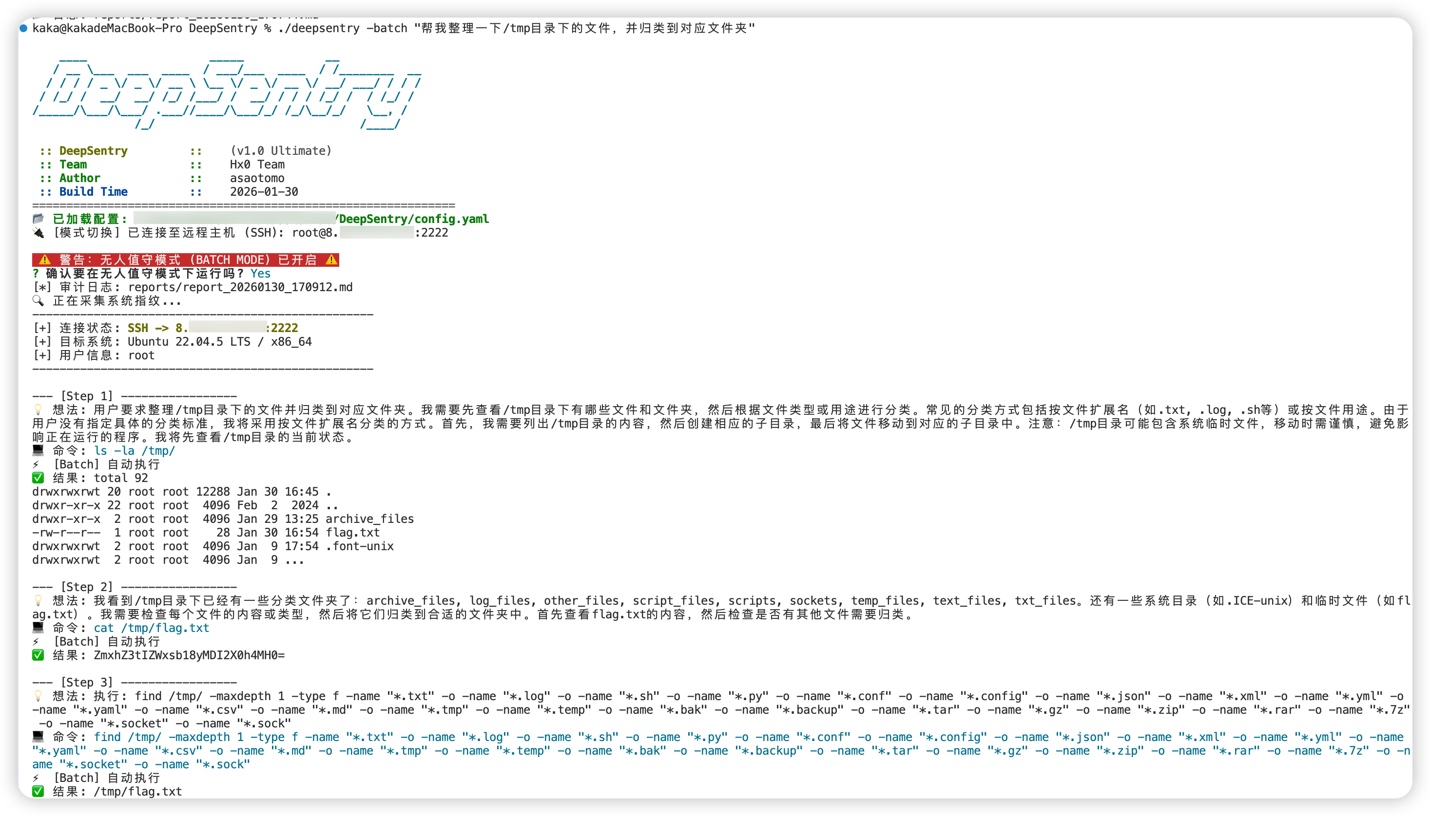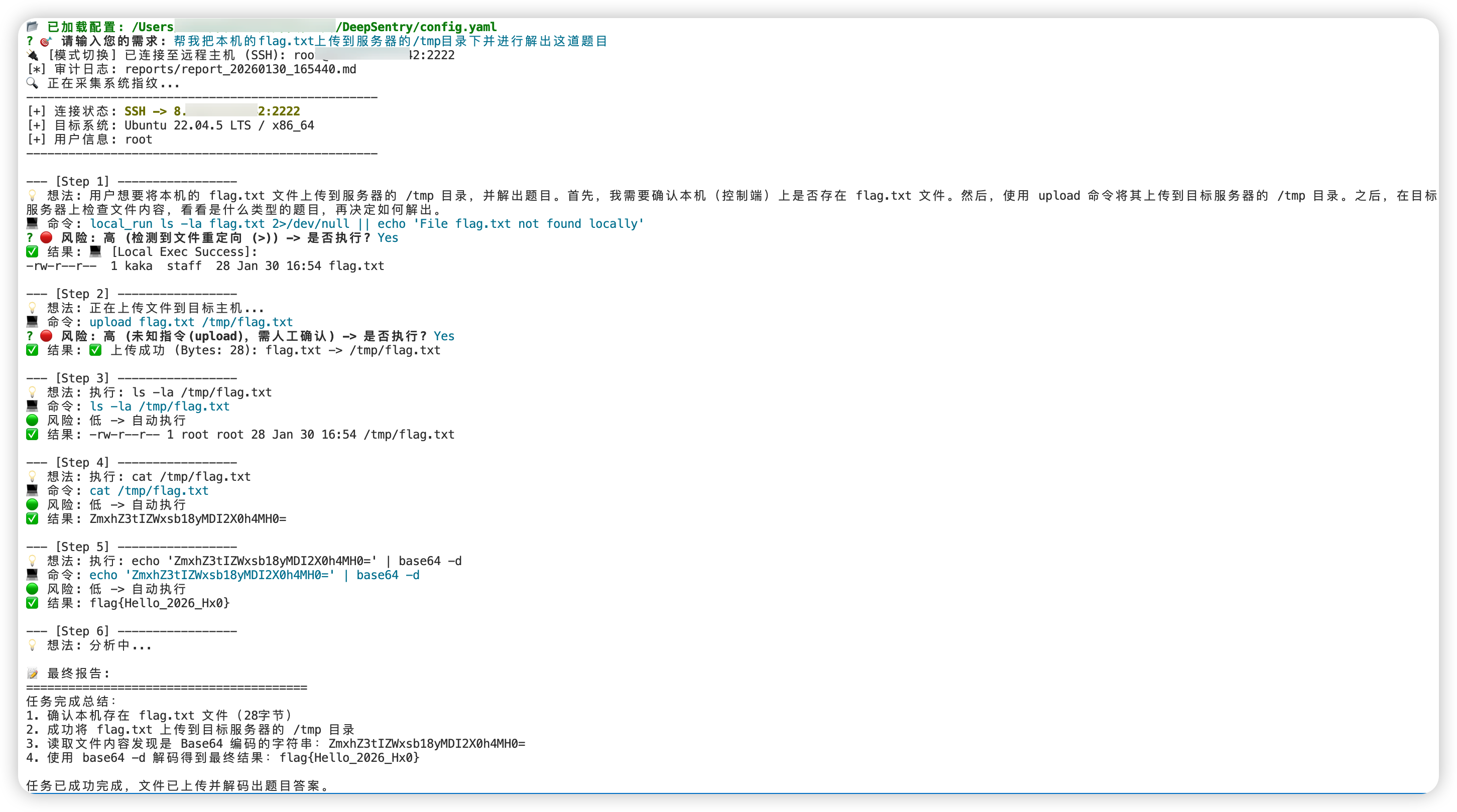 💡 价值 : 展示了 DeepSentry 强大的跨平台上下文感知能力 (Mac端与Linux端命令自动切换)以及自动化解题能力。