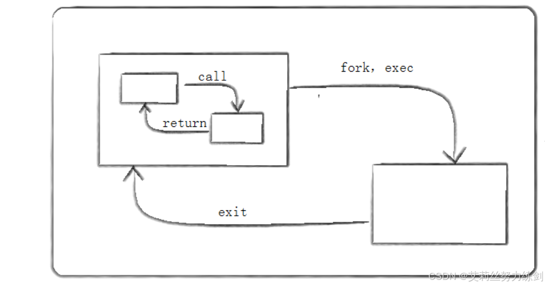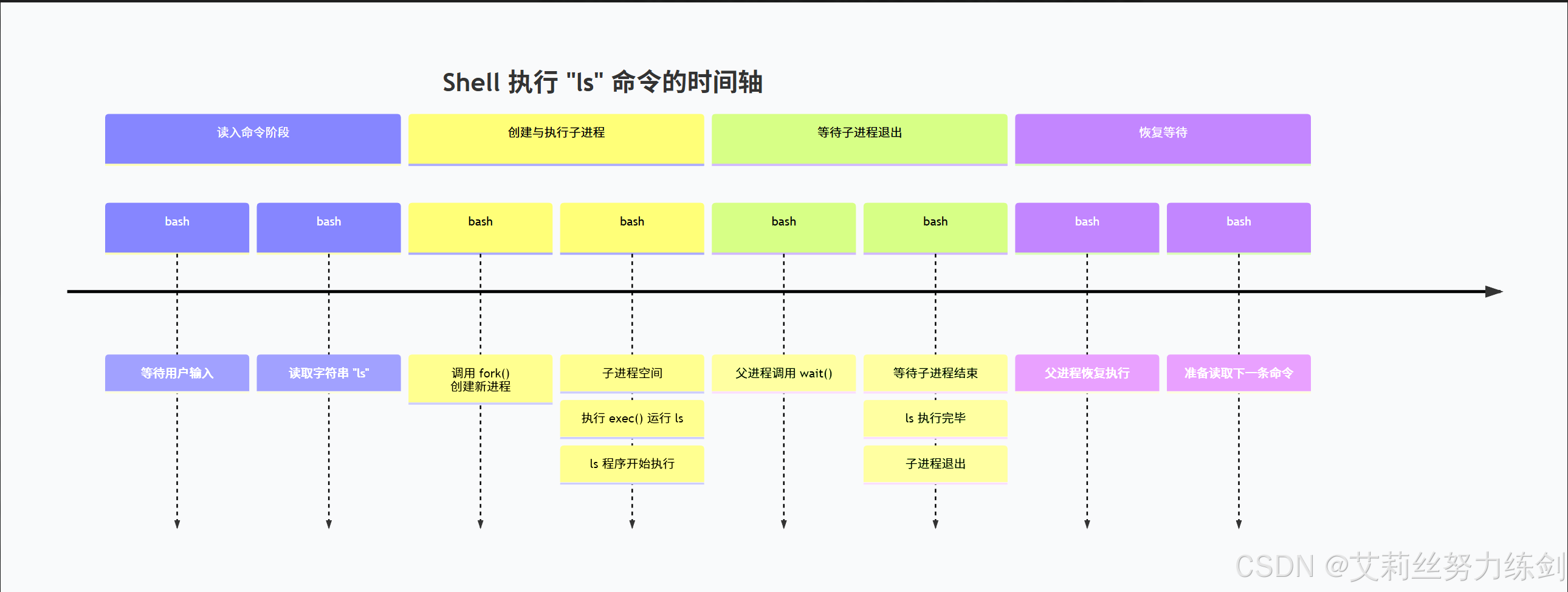 用下图的时间轴表示事件发生的顺序,时间从左向右推移。代表 shell 的方块标识为"sh",并随时间从左向右移动。shell 读取用户输入的字符串"ls",接着创建一个新进程,在该进程中运行 ls 程序,并等待该进程结束。
