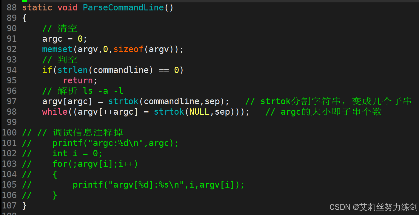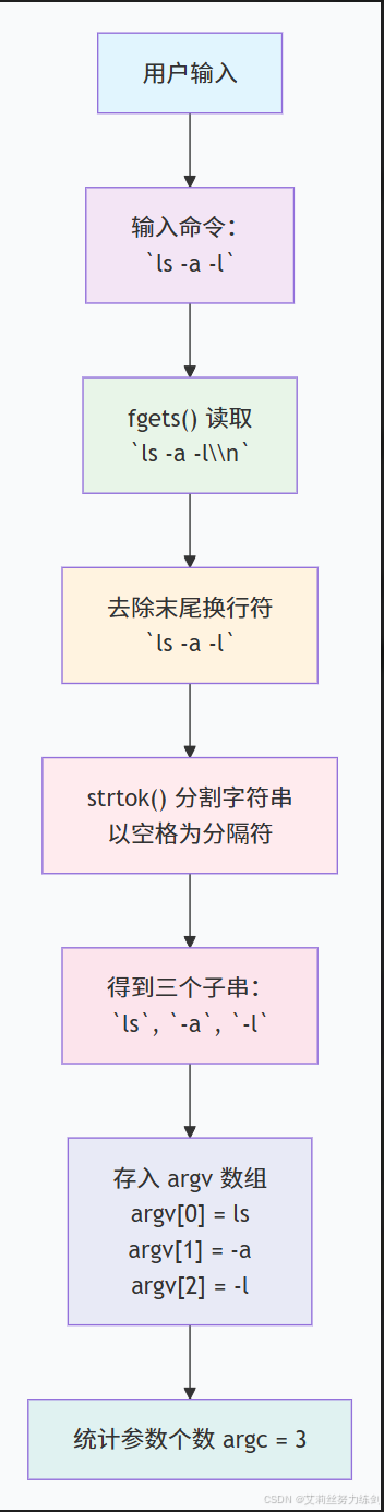 // 第3步:解析字符串,"ls -a -l" -> "ls" "-a" "-l"