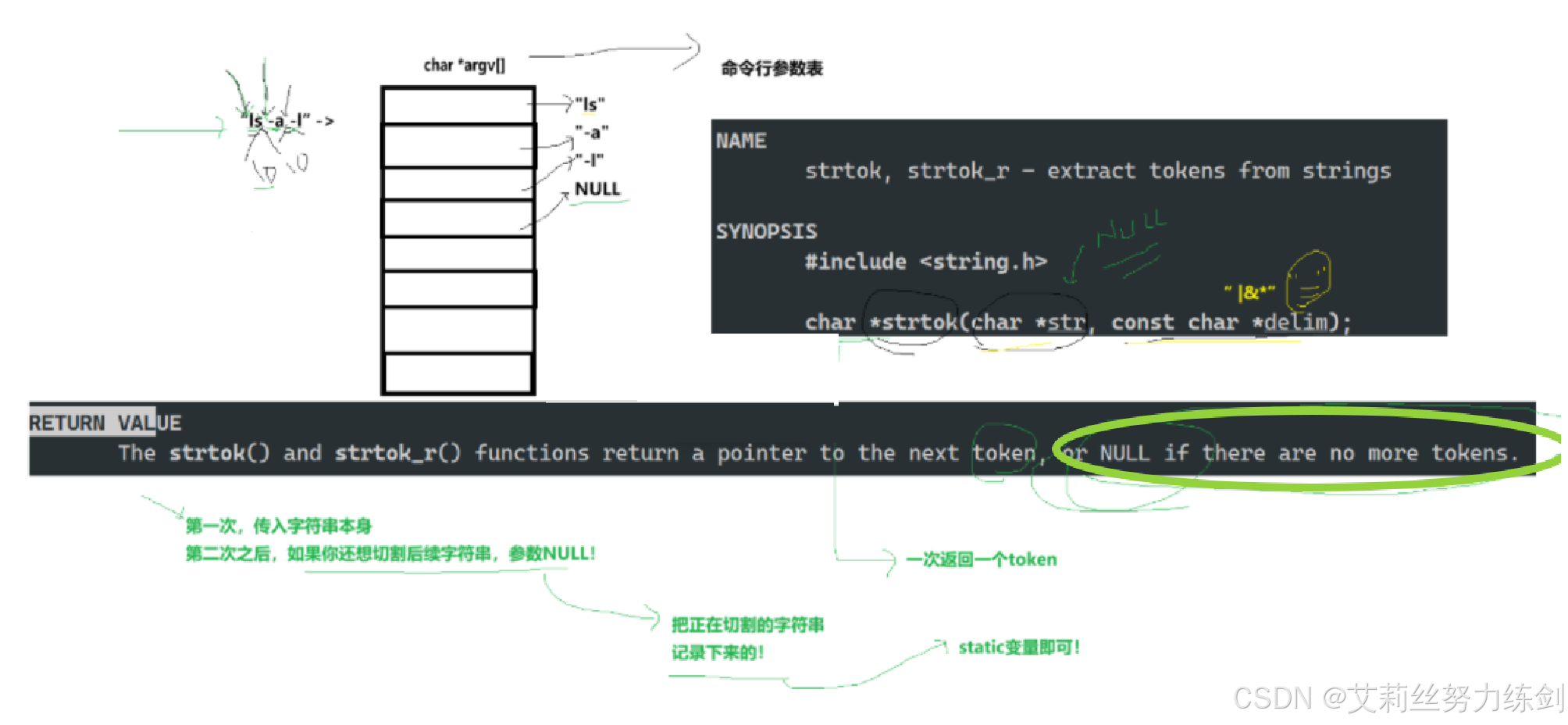 argv[argc] = strtok(commandline,sep); // strtok分割字符串,变成几个子串