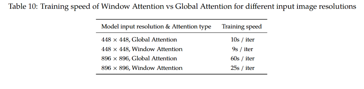 表10:不同输入图像分辨率下窗口注意力与全局注意力的训练速度对比