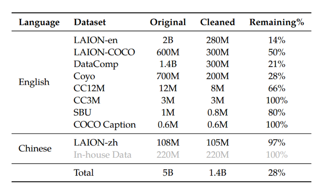 我们使用网络爬取的图文对数据集进行预训练,包括LAION-en(Schuhmann等人,2022a)、LAION-zh(Schuhmann等人,2022a)、LAION-COCO(Schuhmann等人,2022b)、DataComp(Gadre等人,2023)和Coyo(Byeon等人,2022)。我们通过以下步骤清理这些噪声数据: