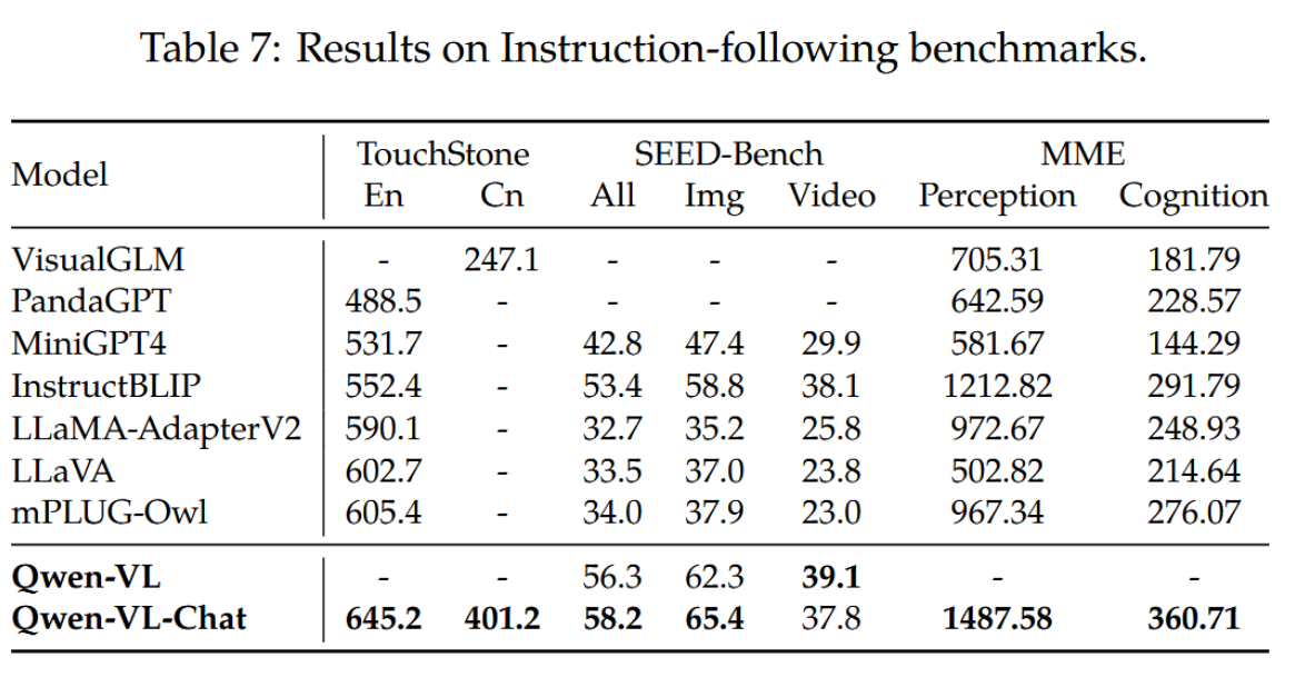 除传统视觉语言测评外,为评估Qwen-VL-Chat模型在真实用户场景中的能力,我们进一步基于TouchStone(Bai等,2023)、SEED-Bench(Li等,2023b)和MME(Fu等,2023)开展测评。TouchStone作为开放式视觉语言指令跟随基准测试,我们在该平台上以中英双语对比了Qwen-VL-Chat与其他指令调优大型视觉语言模型的指令跟随能力。SEED-Bench包含1.9万道经精确人工标注的多选题,用于评估多模态大模型的12项维度(涵盖时空理解)。MME则通过14个子任务同时衡量模型的感知与认知能力。