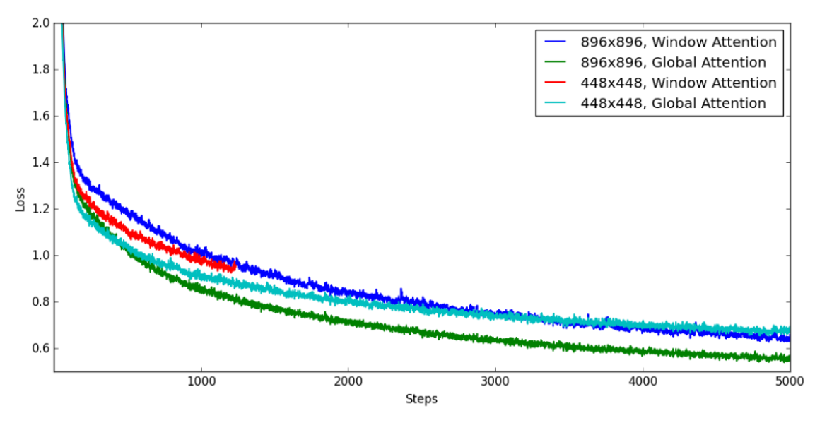 我们未在896×896分辨率下使用窗口注意力机制的原因是,其训练速度对我们而言过慢。尽管该模型在5000步时达到了与448×448分辨率输入模型相近的损失值,但其训练耗时几乎是后者的2.5倍。