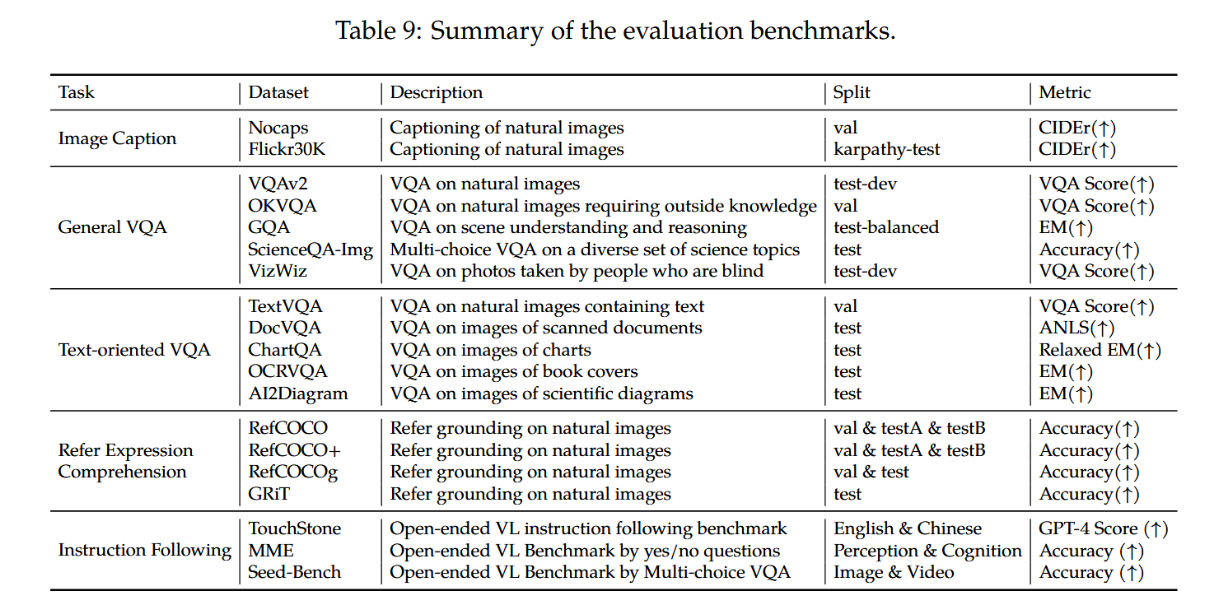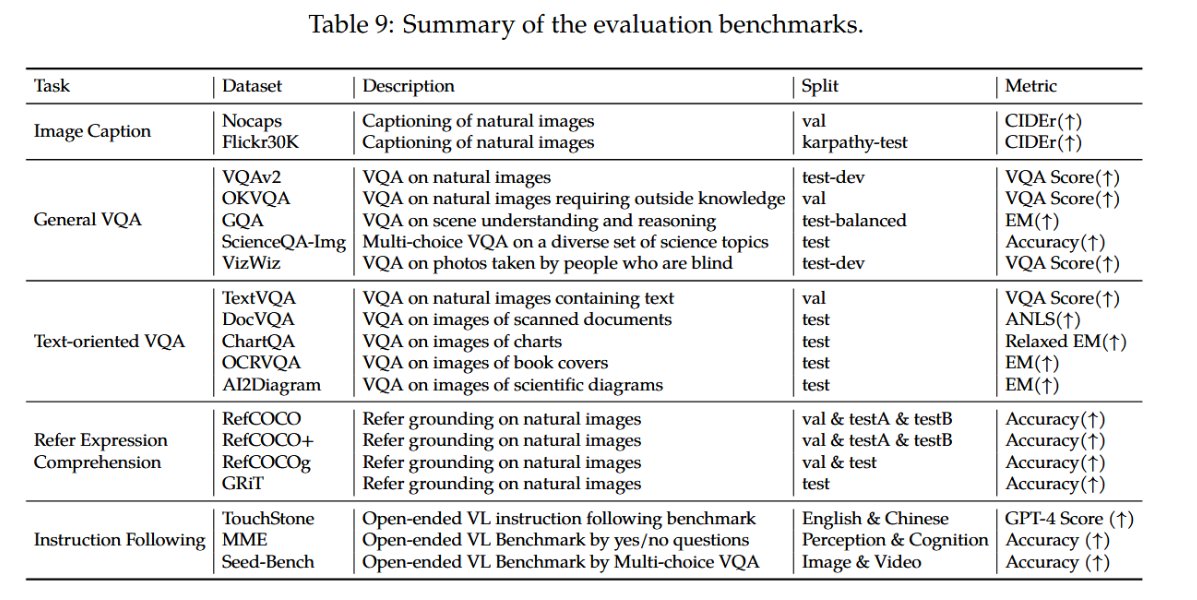 我们在表9中详细汇总了所使用的评估基准及相应指标。