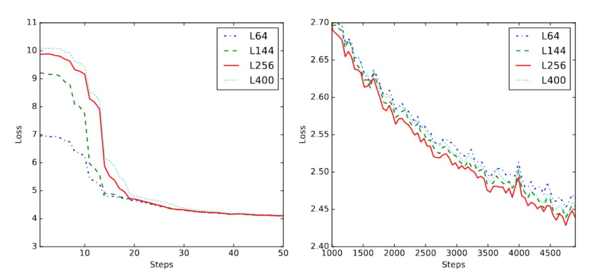 图7:不同视觉语言适配器压缩特征长度下的训练损失可视化。左侧为初始训练损失(50步以内),右侧为收敛阶段的损失(1千至5千步)。图例中,L64表示适配器使用64个查询将视觉特征序列压缩为固定长度64,其余依此类推。损失曲线已进行平滑处理,以避免因波动产生的阴影。