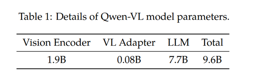 通义千问视觉语言模型(Qwen-VL)的整体网络架构包含三个组成部分,具体模型参数详见表1: