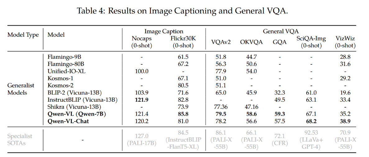图像描述和通用视觉问答(VQA)任务的整体性能展示在表4中。结果表明,在两项任务上,我们的Qwen-VL和Qwen-VL-Chat模型均显著优于之前的通用模型。具体而言,在Flickr30K karpathy-test数据集的零样本图像描述任务中,Qwen-VL以85.8分的CIDEr得分取得了最先进的性能表现,甚至超越了参数规模更大的通用模型(例如拥有800亿参数的Flamingo-80B)。