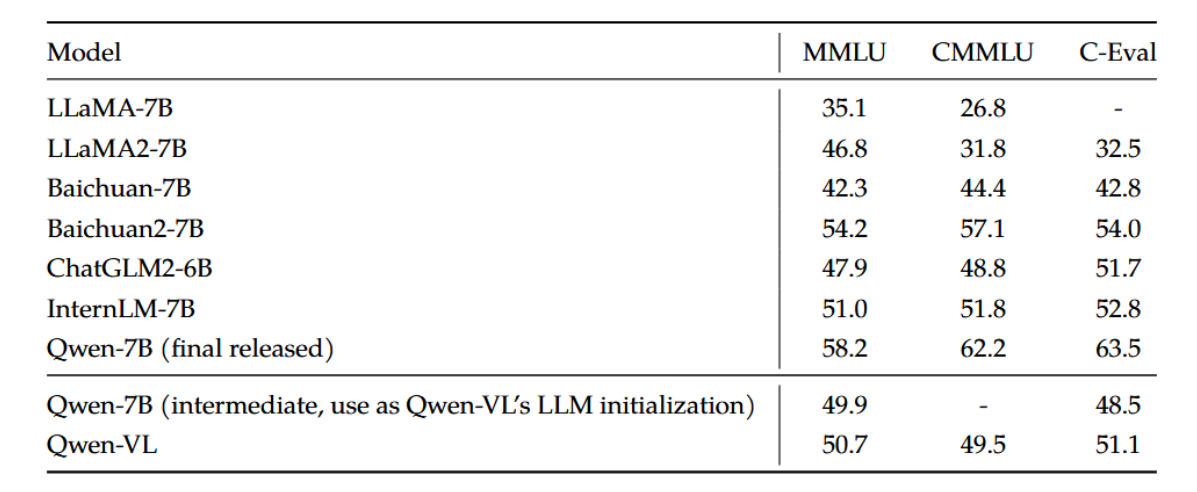 表11:Qwen-VL在纯文本基准测试中的性能与开源大语言模型对比。由于在多任务训练和指令微调阶段引入了纯文本数据,Qwen-VL的纯文本能力未受任何影响。