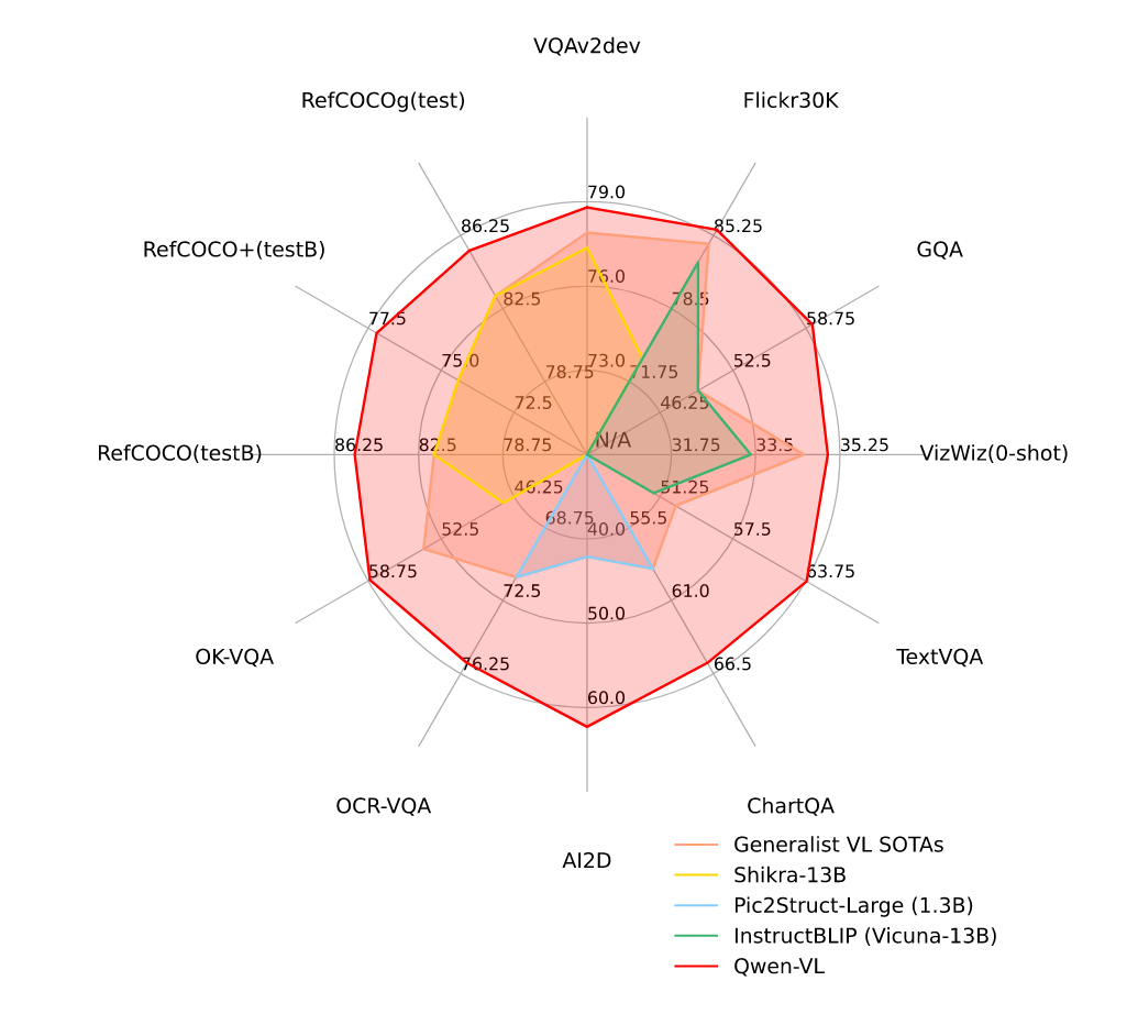 图1:相比其他通用模型,Qwen-VL在广泛任务上实现了最先进的性能。