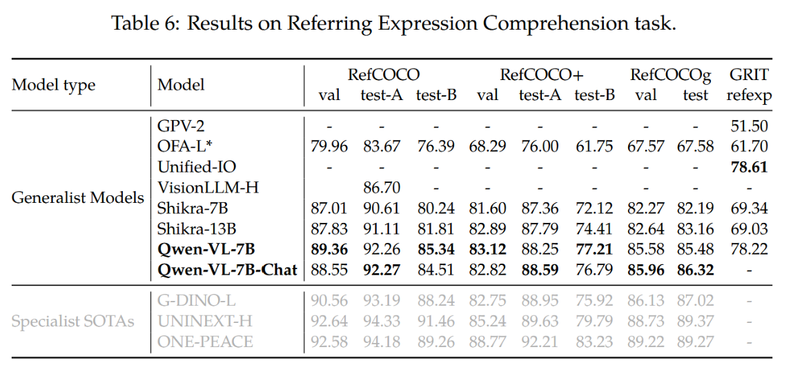 我们通过在RefCOCO(Kazemzadeh等人,2014)、RefCOCOg(Mao等人,2016)、RefCOCO+(Mao等人,2016)和GRIT(Gupta等人,2022)等指代表达理解基准上的评估,展示了模型细粒度的图像理解与定位能力。具体而言,指代表达理解任务要求模型在描述文本的指导下定位目标物体。结果如表6所示。相较于以往的通用模型或近期的大规模视觉语言模型(LVLM),我们的模型在所有基准测试中均取得了最顶尖的成绩。