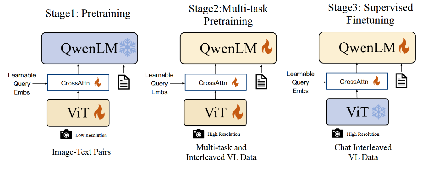 如图3所示,Qwen-VL模型的训练过程包含三个阶段:两阶段预训练和最后的指令微调训练阶段。