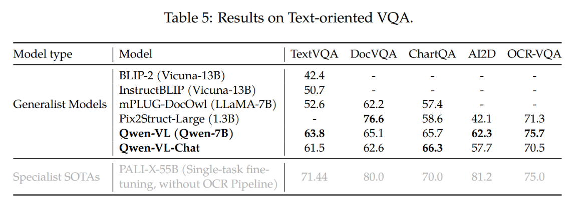 以文本为导向的视觉理解技术在实际应用场景中具有广阔前景。我们在TextVQA(Sidorov等人,2020)、DocVQA(Mathew等人,2021)、ChartQA(Masry等人,2022)、AI2Diagram(Kembhavi等人,2016)和OCR-VQA(Mishra等人,2019)等多个基准测试上评估了模型在文本导向视觉问答任务上的能力。如表5所示,相比此前通用模型及近期大规模视觉语言模型(LVLM),我们的模型在多数测试集上展现出更优性能,且优势幅度显著。