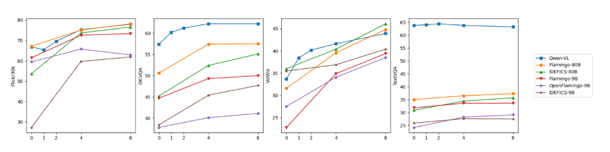 我们的模型还展现出令人满意的上下文学习(即小样本学习)能力。如图4所示,在OKVQA(Marino等人,2019)、Vizwiz(Gurari等人,2018)、TextVQA(Sidorov等人,2020)和Flickr30k(Young等人,2014)任务上,千问-VL通过上下文小样本学习取得了优于参数量相近模型(Flamingo-9B(Alayrac等人,2022)、OpenFlamingo-9B(?)和IDEFICS-9B(?))的性能。其表现甚至能匹敌参数量大得多的模型(Flamingo-80B和IDEFICS-80B)。需要说明的是,本研究采用简单随机采样构建小样本示例,未使用更优效的复杂构建方法(如RICES(Yang等人,2022b))。