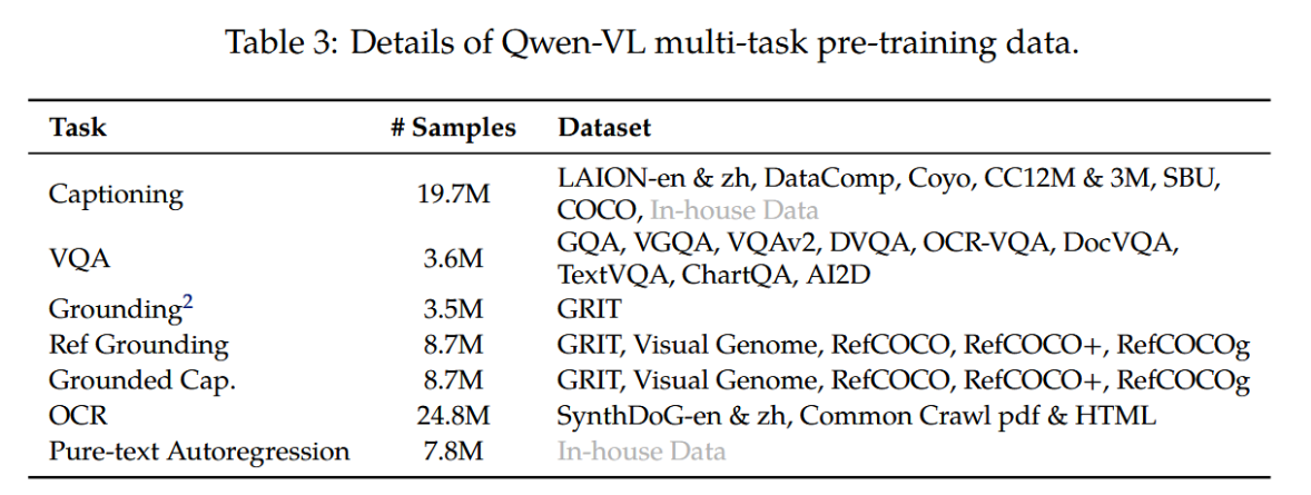 表3:Qwen-VL多任务预训练数据明细。