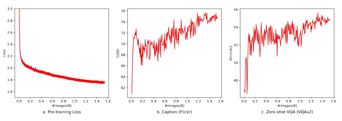 在图6中,我们展示了预训练阶段(第一阶段)的收敛情况。所有模型均使用BFloat16混合精度进行训练,批次大小为30720,学习率为2e−4。所有图像仅训练一次(一个周期)。随着训练图片数量的增加,训练损失稳步下降。需要注意的是,预训练阶段(第一阶段)未加入任何VQA数据,但零样本VQA分数在波动中呈现上升趋势。
