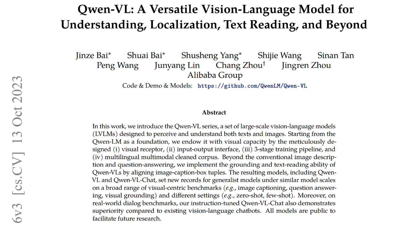 在本工作中,我们推出Qwen-VL系列大规模视觉语言模型,该模型可同时感知和理解文本与图像信息。我们以Qwen-LM为基底,通过精心设计的(i)视觉接受器、(ii)输入输出接口、(iii)三阶段训练流程及(iv)多语言多模态清洁语料库赋予模型视觉能力。除常规图像描述与问答功能外,我们还通过对齐图像-描述-边框三元组实现了Qwen-VL的视觉定位与文字识别能力。最终模型(含Qwen-VL与Qwen-VL-Chat)在跨领域视觉基准测试(如图说生成、视觉问答、视觉定位)及不同设置(如零样本、少样本)下刷新了同类通用模型的最优记录。在真实场景对话评测中,经指令微调的Qwen-VL-Chat相较现有视觉语言对话系统亦展现出显著优势。所有模型均已开源以推动后续研究。