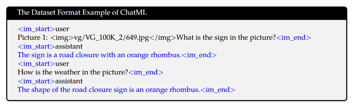 为更好地适应多图像对话与多图像输入场景,我们在不同图像前添加"Picture id:"标识符,其中id对应图像输入对话的次序。在对话格式方面,我们采用ChatML(Openai)格式构建指令微调数据集,每个交互语句均使用两个特殊标记(<im_start>与<im_end>)进行界定,以支持对话终止功能。