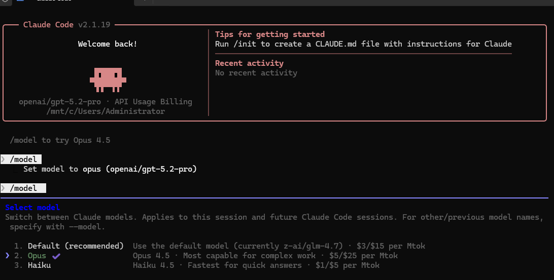 在claude 切换的时候 目前指向是有问题 可以忽略 记住配置文件 就行 例如 OPUS 实际指向的是gpt-5.2-pro