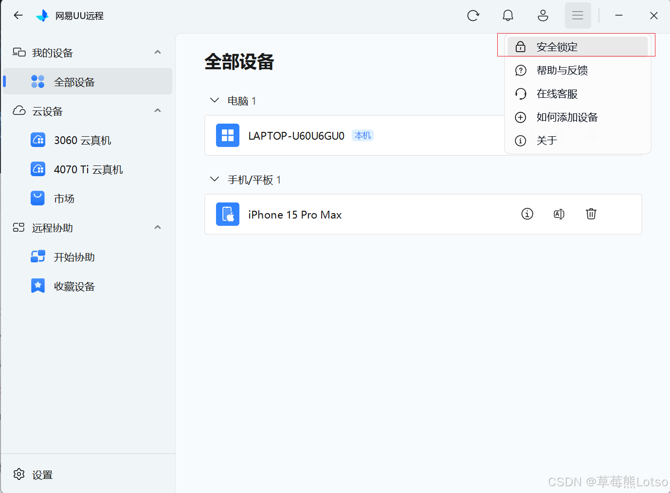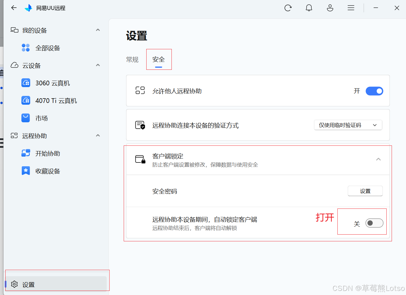 - 在【设置】-【安全】中开启"远程协助期间自动锁定客户端"