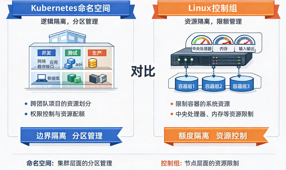 Namespace 是集群里的"分区管理",cgroup 是节点上的"资源限流"。
