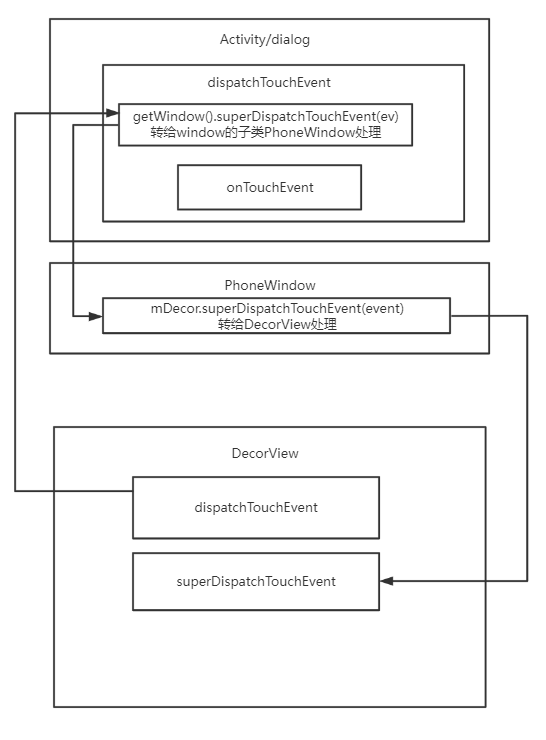 所以传递的机制是:ViewRootImpl->DecorView->Activity->Window->DecorView-> ViewGroup