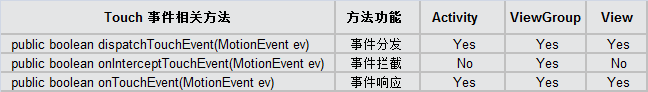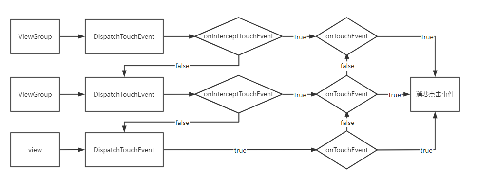 ViewGroup的DispatchTouchEvent收到触摸事件后,会询问onInterceptTouchEvent(注意, onInterceptTouchEvent是ViewGroup类型的View独有的方法)是否需要拦截此次触摸事件?如果拦截返回true,事件将会转到自己的onTouchEvent中处理。如果不拦截,事件将传到它的子View,下一层的ViewGroup的DispatchTouchEvent 。
