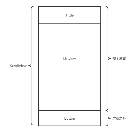 示例外层为一个ScrollView,内层为TextView+ListView+TextView,这两个TextView分别为"Tittle"和"Bottom",显示在ListView的顶部和底部,添加它们是为了方便观察ScrollView的滑动效果。最终的布局效果如下所示: