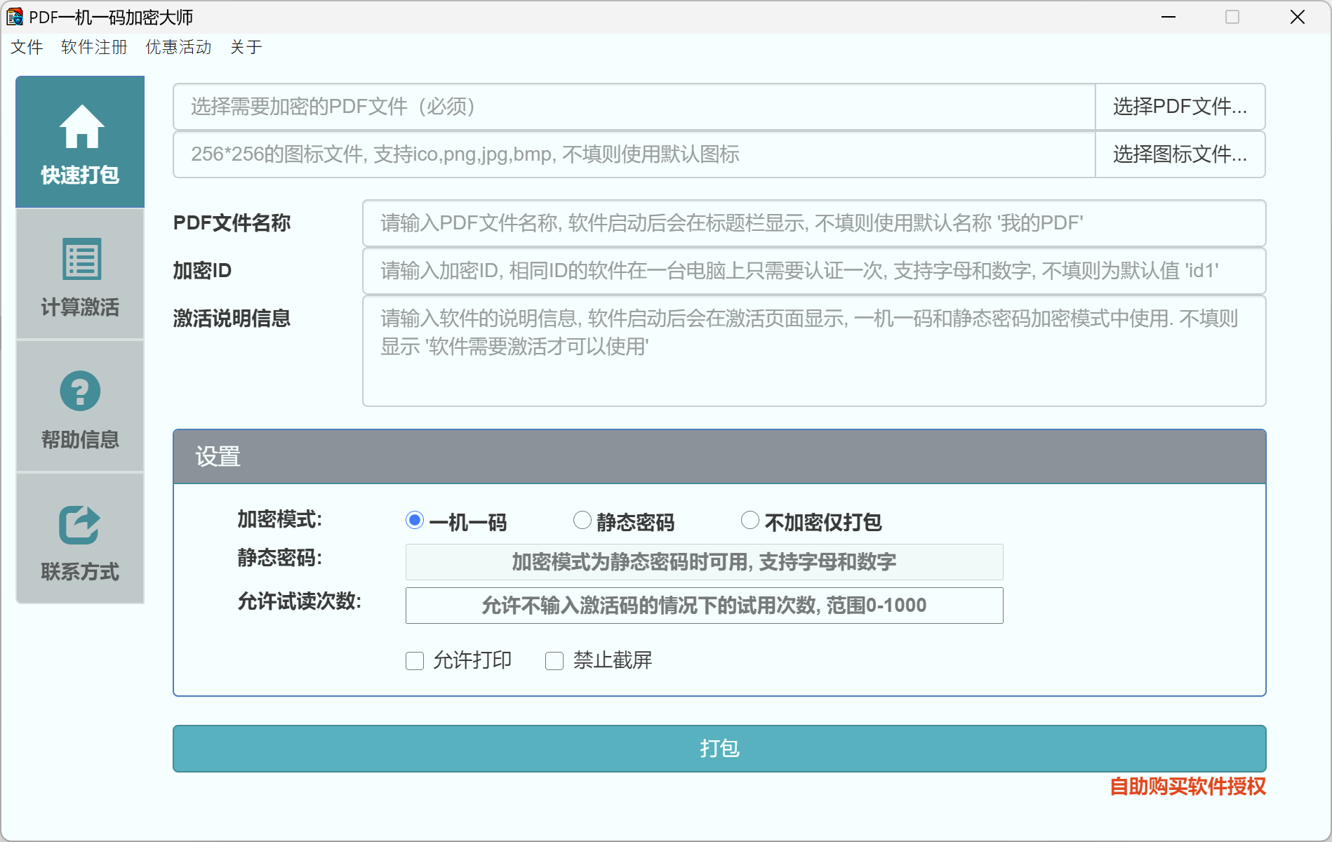 PDF一机一码加密大师(PDF强力加密), 可以加密任意PDF文档,给PDF文件添加一机一码授权, 静态密码等, 防止用户复制传播重要PDF文件,或者打印PDF文档中的内容,并且加密生成的PDF在其他用户电脑上无需安装第三方阅读器即可直接阅读。