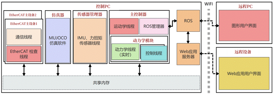 图7-8清晰展示了软件架构的协同逻辑,EtherCAT主设备双进程与传感器管理器(IMU/力扭矩传感器)、主控制器(运动学/动力学计算)通过共享内存实时交互,ROS负责远程控制与状态可视化,形成"通信-感知-控制"闭环,且所有实时线程(灰色标注)独立部署,避免非实时任务干扰。