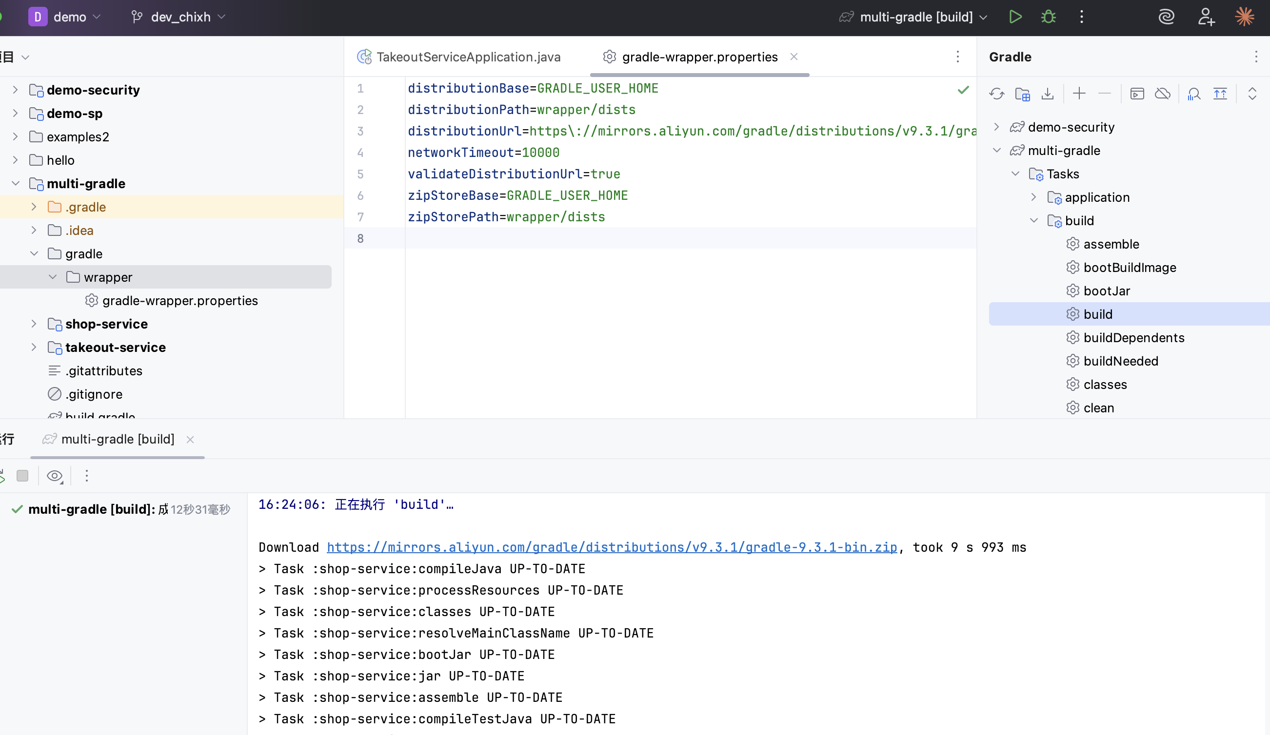 父目录为multi-gradle,两个子目录,一个为购物服务,一个为外卖服务,购物服务目录为shop-service,外卖服务为takeout-service. - 配置Gradle Wrapper,见gradle-wrapper.properties