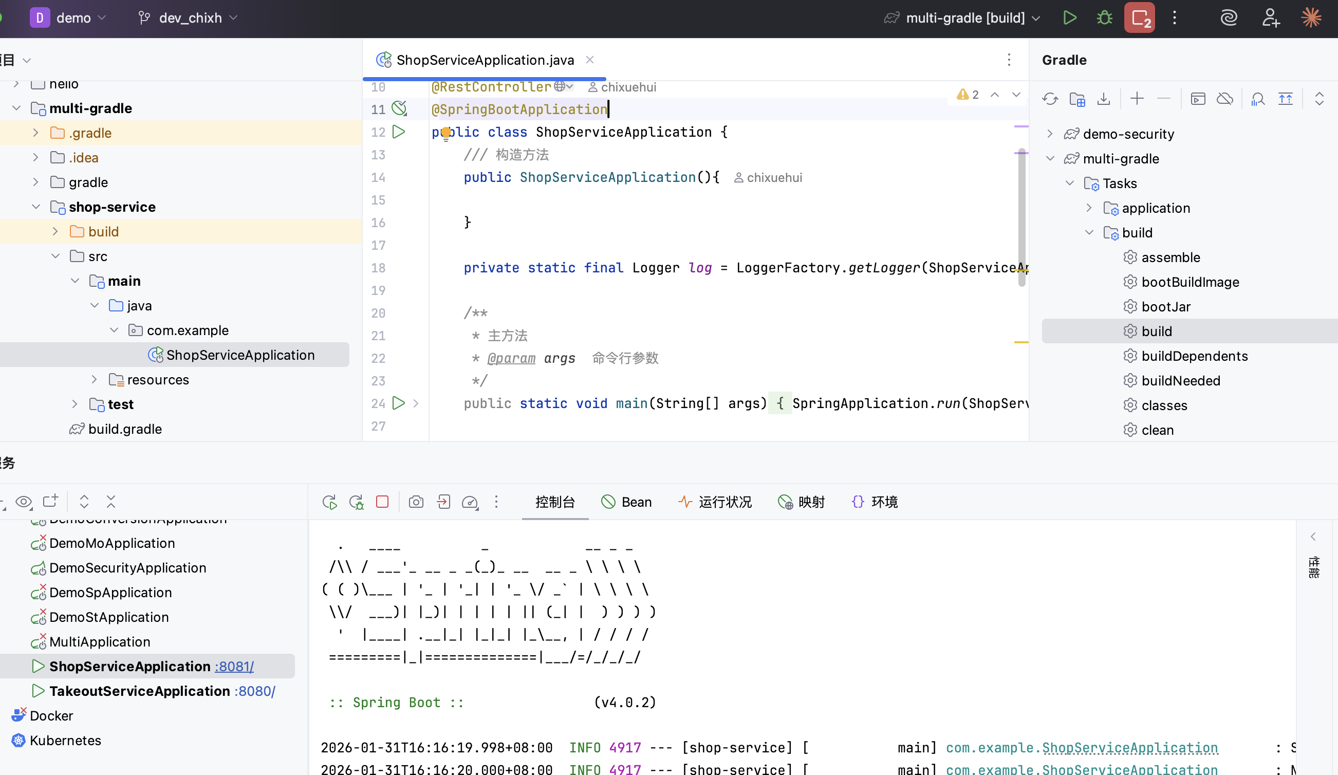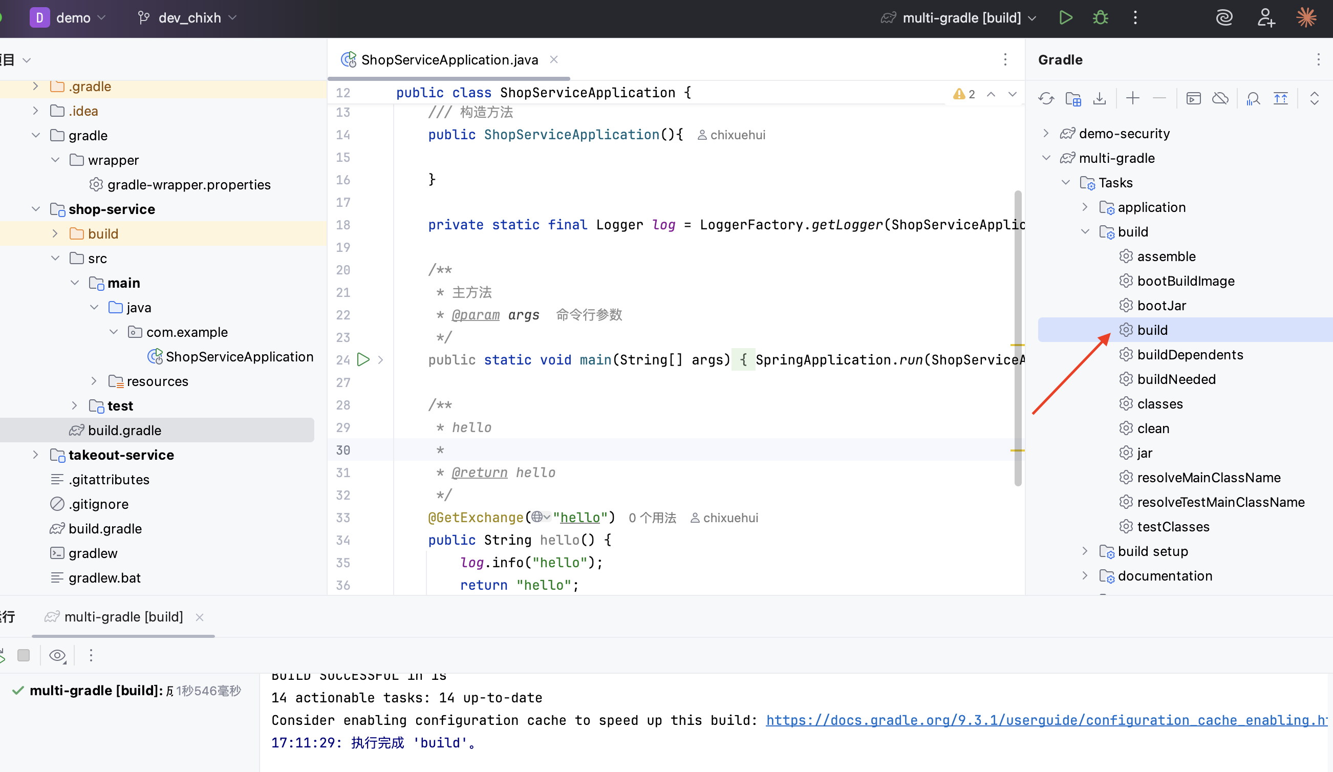 设置了两个子工程,分别是购物和外卖,且子工程名称与子项目目录名完全一致. - 编写购物服务子工程构建脚本,见shop-service/build.gradle